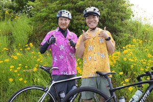 アロハシャツを着るもよし。ムームー風のウェアを作るもよし。ハワイアンアクセサリーのワンポイントだったり、自転車のカスタマイズでもOK。思い思いのハワイを表現してみてください。ただし自転車の走行に危険を生じるものはお控えください。
